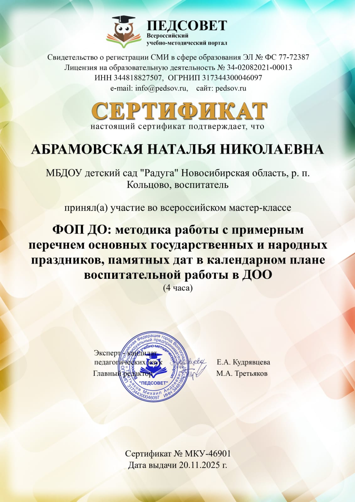 Сертификат за выступление на августовской конференции